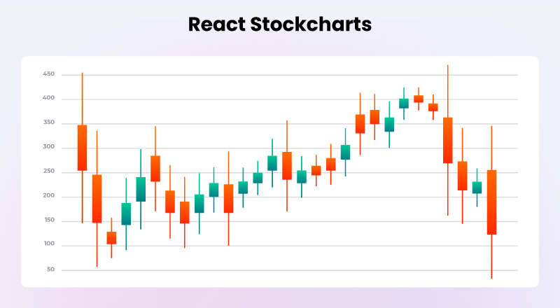 The react-stock-charts library is specifically prepared for showcasing stocks and financial data. react-stock-charts library offers several types of charts like Scatter, Area, Line, Candlestick, OHLC, Heiken Ashi, Renko, Kagi, Point &and figure react-stock-charts library also provides different chart indicators like EMA, SMA, and WMA, TMA, Bollinger band, SAR, MACD, RSI, ATR, and many other interactive indicators.